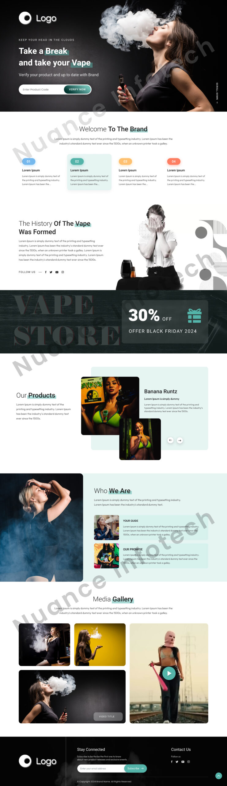 A bold and modern landing page UI concept designed for a vape brand, focused on product verification, brand trust, and promotional engagement. The layout highlights a strong visual hero section with product code verification, brand introduction, vape history, product showcases, discount offers, media gallery, and a newsletter subscription area.